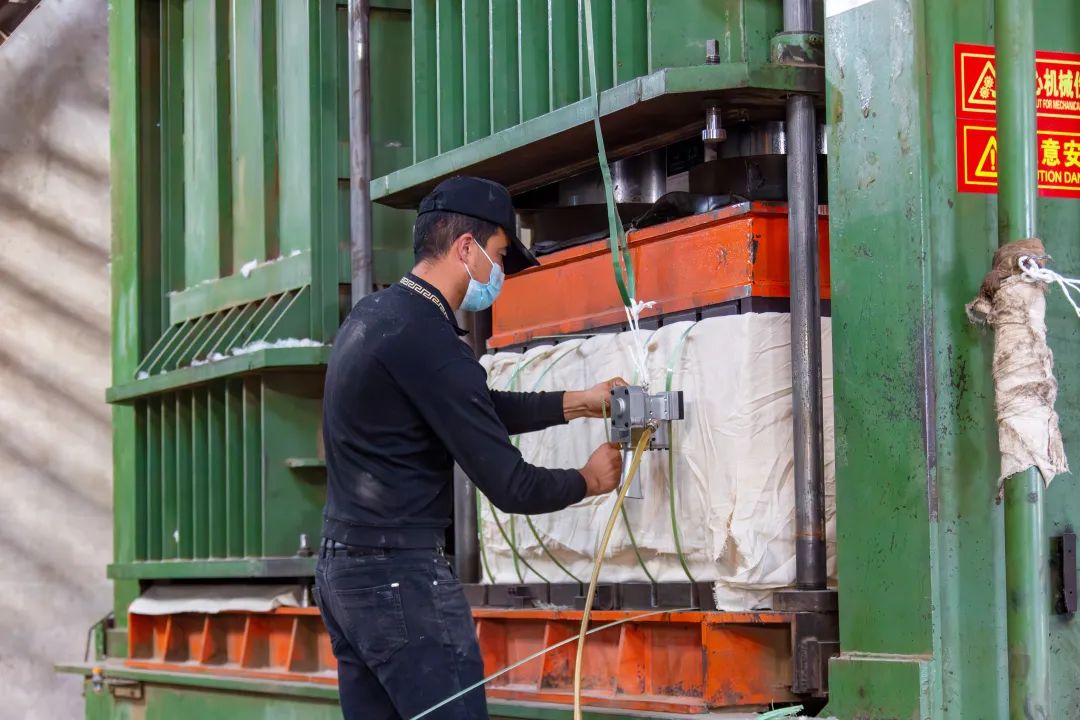 轧花车间工人们忙着轧花、打包、码垛,进行“一条龙”生产,经过多道加工工序,一包包成品皮棉加工完成。