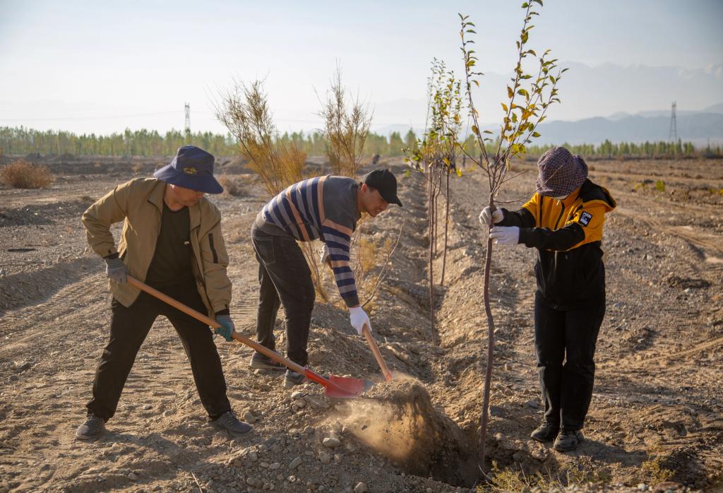 大河沿子镇党委副书记、镇长亚尔买买提·吐尔逊:“今年,我们根据大河沿子镇养殖园区、南戈壁的土壤条件,选取了适合沙地生长、成活率高的树种,主要是香妃海棠、大果沙枣、青皮杨树、桑树。后期,我们会安排专人对种植的苗木进行灌溉、管护等工作,确保种植一片、成活一片。”