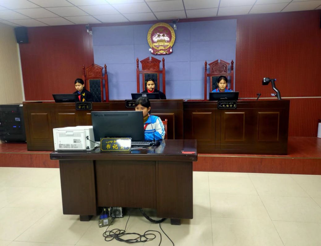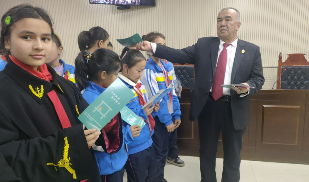 在大河沿子审判庭,同学们在法院干警的帮助下穿上法袍、敲响法槌,开展“模拟法庭”,有模有样地当起了小审判长、小审判员、小公诉人、小法警等,感受司法权威,在心中播下法治种子。