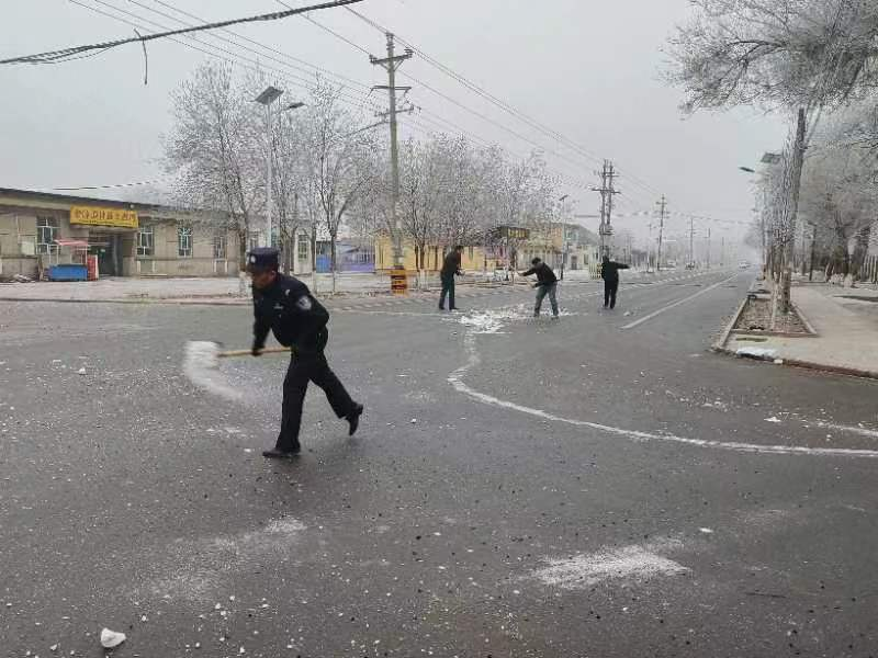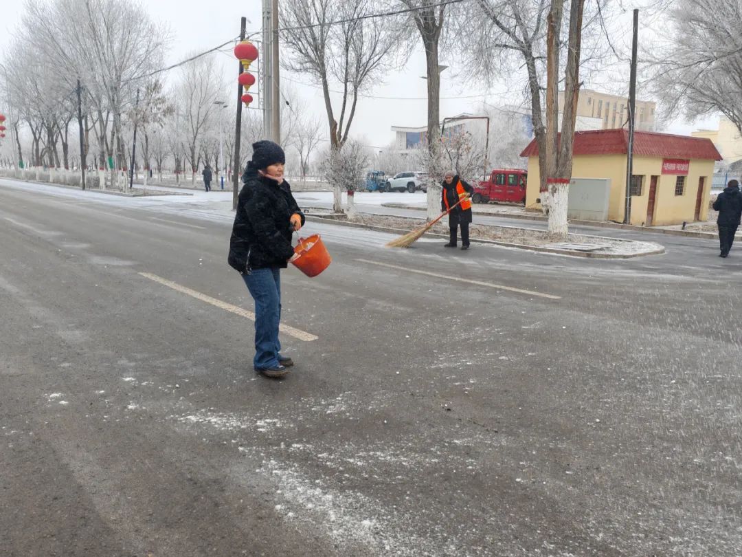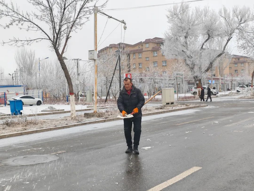 近日,受强冷空气影响,大河沿子镇辖区内部分路面出现不同程度凝冻现象,道路湿滑,群众出行安全及生产生活受到影响。为积极应对低温凝冻天气,保障人民群众生命财产安全,1月4日上午,大河沿子镇组织镇村干部、志愿者开展“抗凝冻、保畅通”撒盐破冰服务活动,迎着寒风对主干道、通村路撒盐破冰,保障道路畅通,守护群众出行安全。