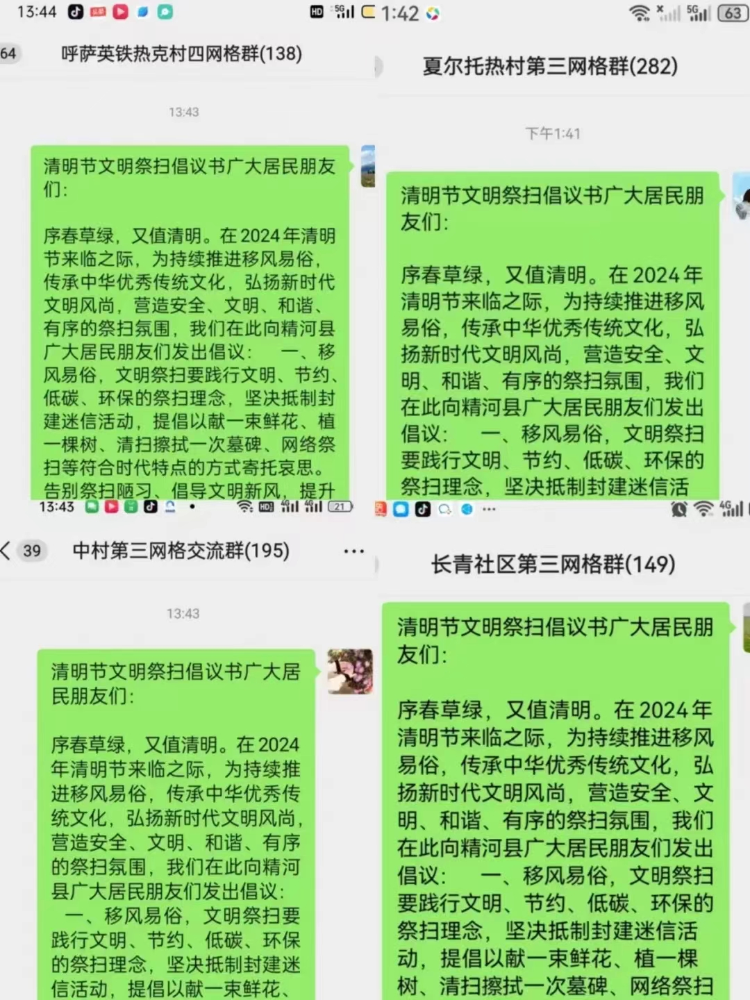 线上,村社区利用微信群发放倡议书,向居民广泛宣传“文明祭祀,绿色清明”的理念,引导居民除陋习、扬新风,树立健康、文明、积极向上的健康生活方式,并且普及了火灾的危害以及如何有效防止火灾等知识,引导辖区居民牢固树立防火意识。