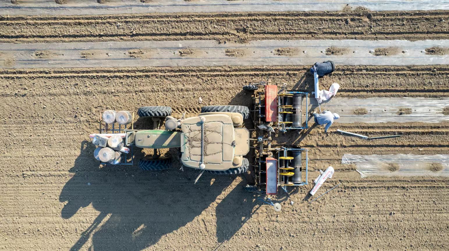 3月26日,在精河县大河沿子镇额勒森陶勒盖北村种植大户郝秋芬的200亩西瓜地里,搭载北斗导航系统的大马力在农田里来回穿梭,轰隆声响彻田间地头,一派繁忙的春播景象。
