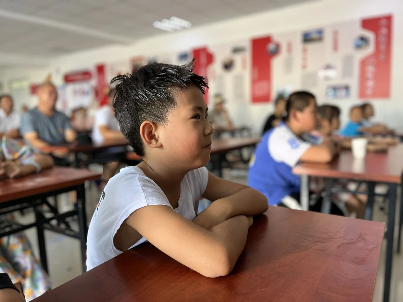 “红星闪闪,放光彩;红星灿烂,暖心怀……”铿锵有力的歌声把孩子们带入故事中。电影《闪闪的红星》主要讲述了红军长征离开后的江西苏区少年潘冬子的故事,他的父亲响应号召参加红军,只剩母亲与东子相依为命。受其母亲的影响,年仅11岁的冬子,在闪闪红星的照耀下,成为真正的红军战士的故事。观影过程中,孩子们十分认真专注,完全沉浸在影片精彩的情节当中,伴随着影片中紧张、惊险的片段,孩子们也切实感受到了红军战士抛头颅洒热血的爱国热情,影片所展现的爱国情怀引发了在场青少年的共鸣。