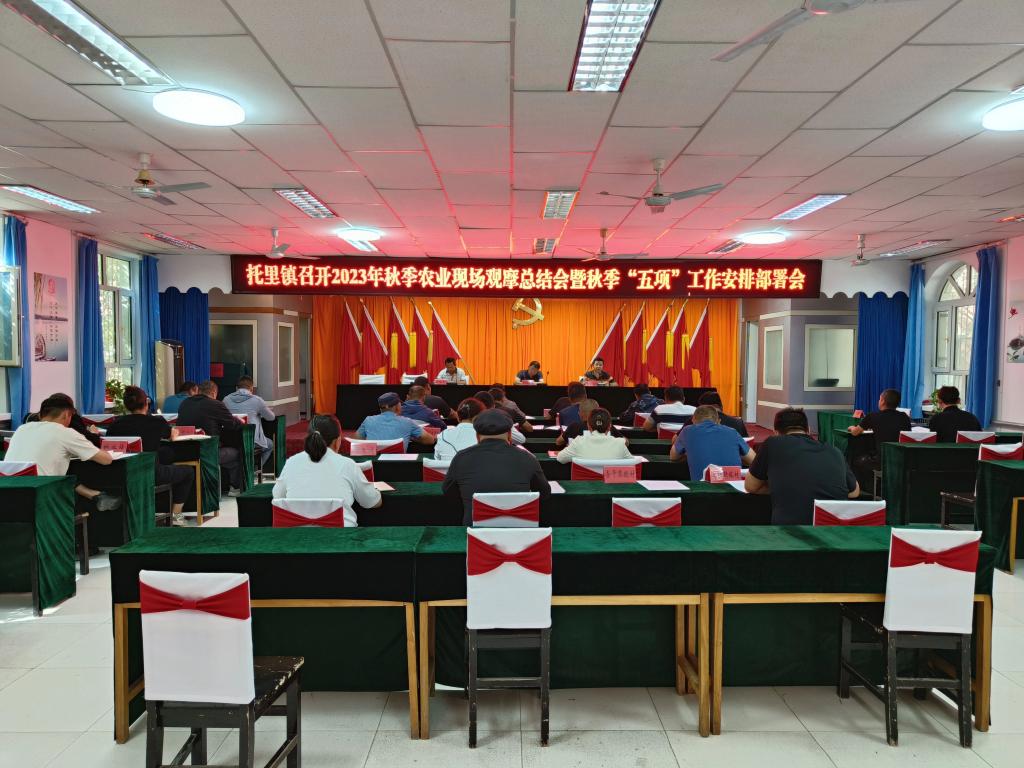 观摩结束后,与会人员在托里镇文化中心召开了秋季农业现场观摩总结会暨秋季“五项”工作安排部署会。会议传达学习《关于做好2023年精河县废旧农膜回收利用的通知》,各村队签订农业秋季重点工作目标责任书,托里镇党委镇长阿·才登巴力同志就各项秋季重点工作进行了具体安排部署。