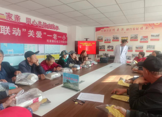 活动邀请托里卫生院的医生免费为辖区老人进行身体健康检查和调理身体问题。活动现场,医生用《预防秋冬季节多发疾病--老年人篇》课件深入浅出、通俗易懂的语言讲解,社工们引导老人有序就诊,为出行不便老人提供优先服务,义诊过程中医护人员与社工暖心接待每一位前来就诊的老人,细心地为老人们测量血压、指导用药等服务。义诊过程中医生一边认真地回答老人的疑问,一边针对检查中发现的问题,叮嘱老人们要注意的相关事项,耐心解答老人们提出的各类健康问题,并引导大家养成健康的生活方式和生活习惯。