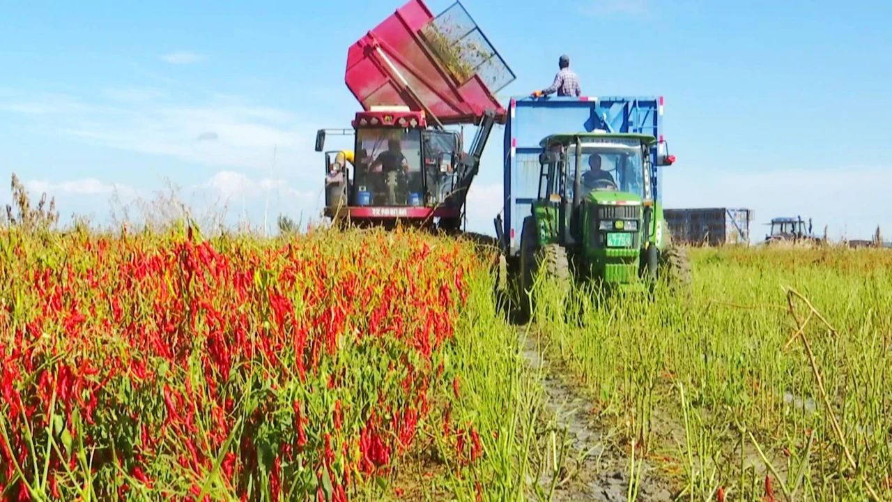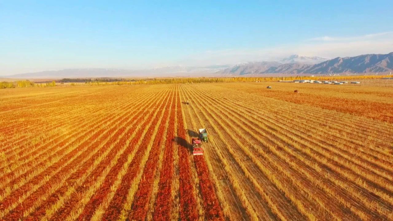 种植户韦广仲在辣椒地里忙得热火朝天,看着满地的红辣椒,他喜上眉梢。“吾夏克巴依西村的地理条件非常适合种植辣椒,今年辣椒的亩产在500公斤左右,采收使用机械化作业,一天能收100多亩地。我的这块地大概有700亩,多台机器联合作业,4天就能收完了。”韦广仲说。