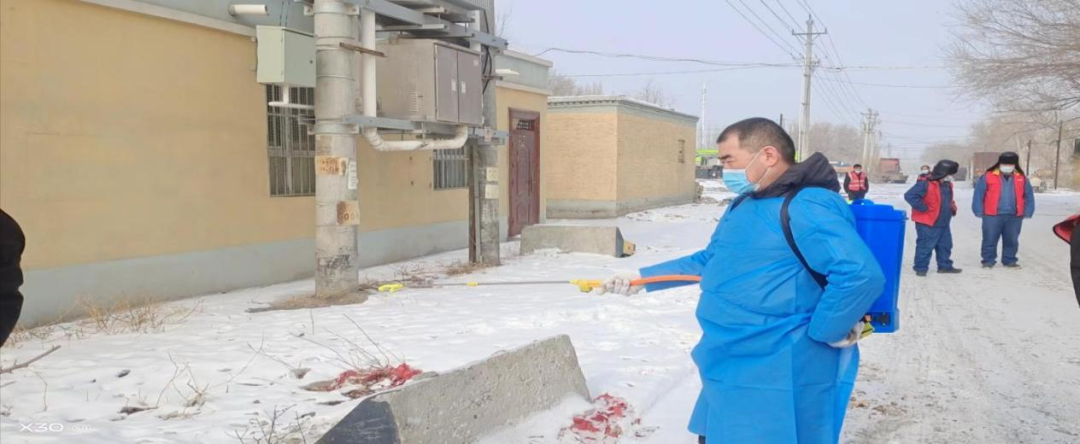 防疫消杀组着一级防护背消毒桶进行现场消杀。