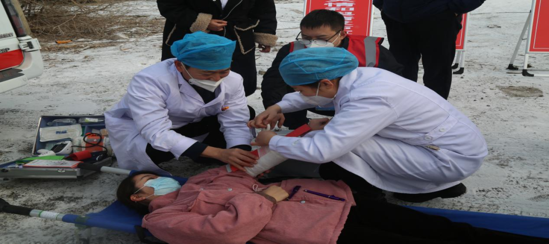 医疗救护组将“受伤人员”用担架抬到预定救护地点,进行现场模拟伤员急救。