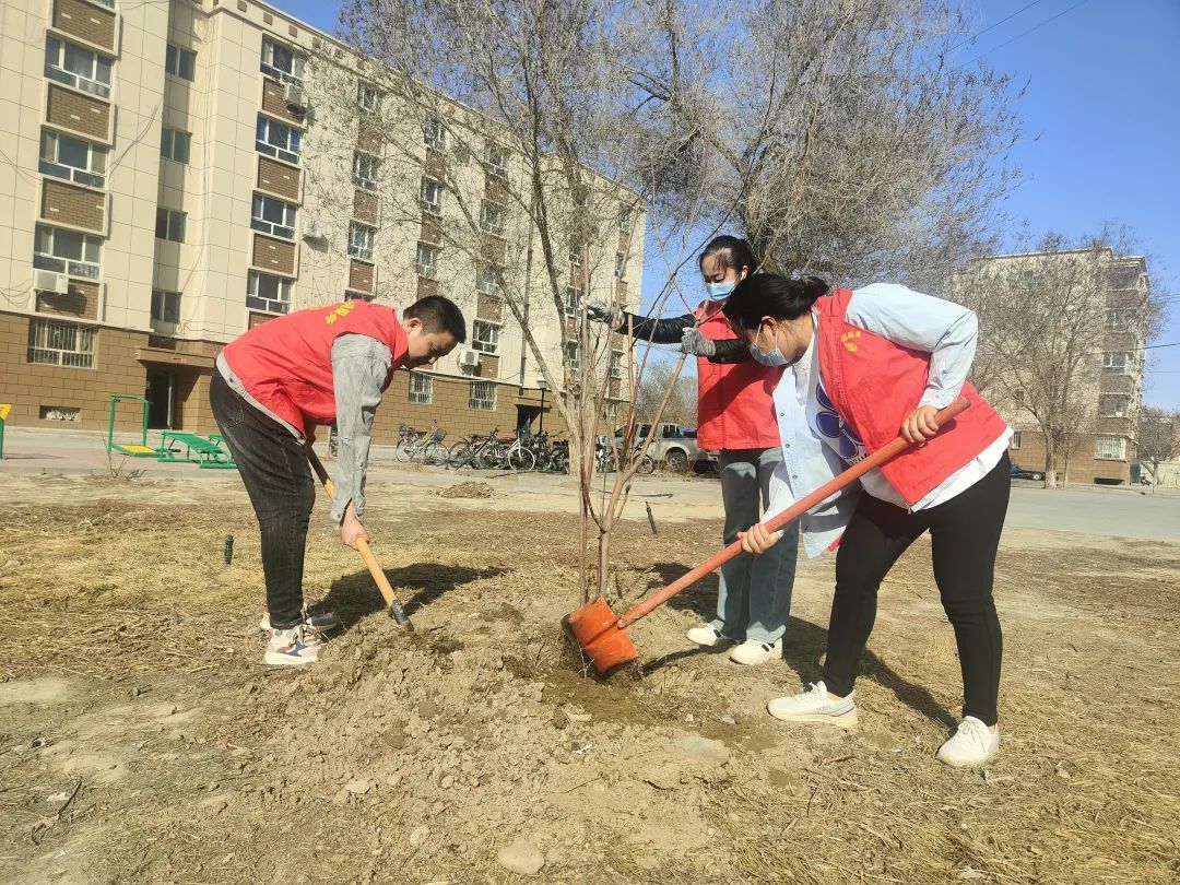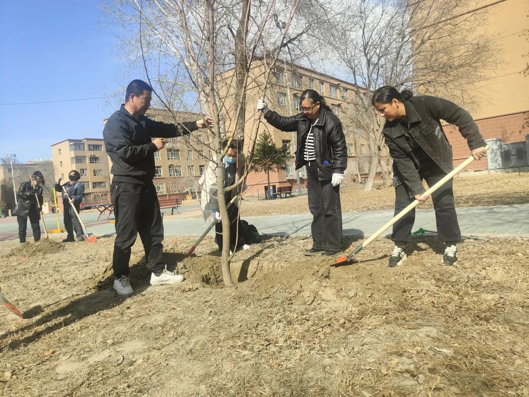 植树现场,各社区积极行动对小区内空闲区域进行了增绿补绿,并对枯枝、枯叶、断枝进行了修剪、整形。现场一片热火朝天的场景,大家热情高涨、相互配合、干劲十足。有的挥锹铲土、有的搬运树苗、有的扶苗填坑,每个步骤都有条不紊地进行着。