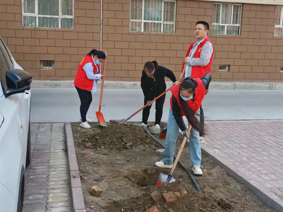 不负春光,一起为绿“充植”。经过大家的辛勤努力,一棵棵核桃、沙枣、苹果、杏树苗扎根土壤,为小区增添了一道绿色的风景线,也为初春增添了一片盎然生机。