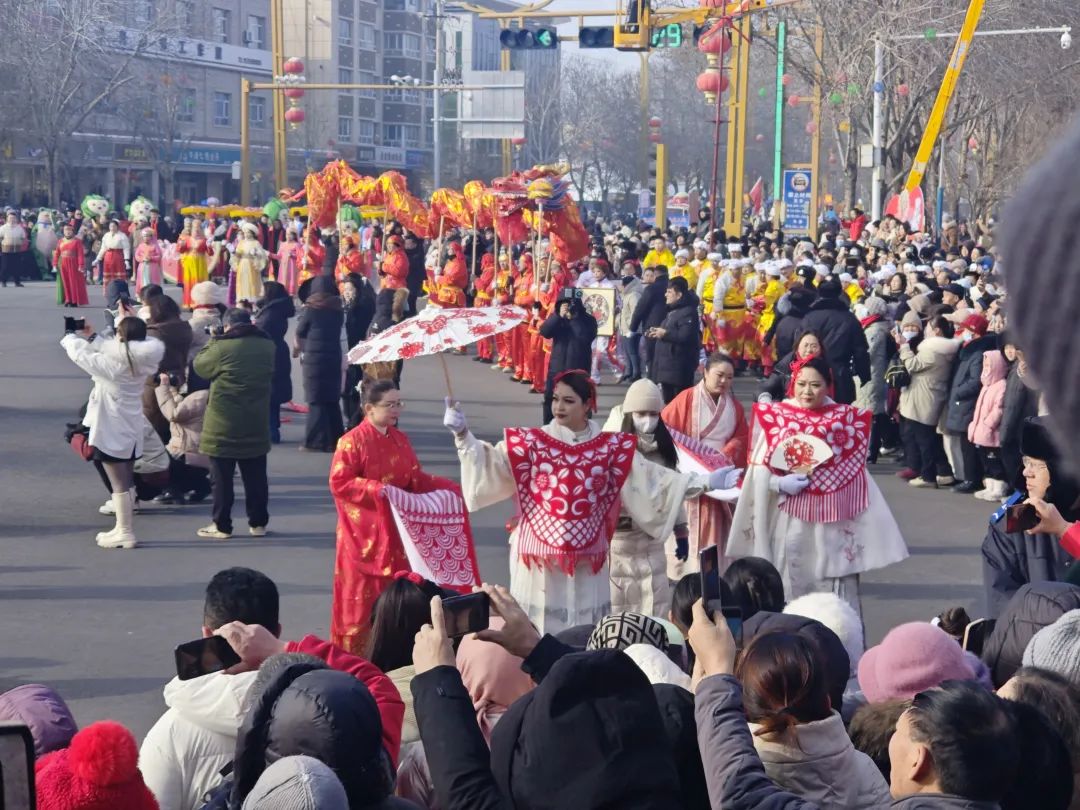 社火队伍中,7位身着剪纸服饰的成人演员惊艳全场:衣袂翻飞间,镂空的龙凤纹样随步伐流转光影,牡丹、祥云化作立体剪影缀满裙裾,仿佛古老的窗花跃出红纸,化身行走的民俗画卷。