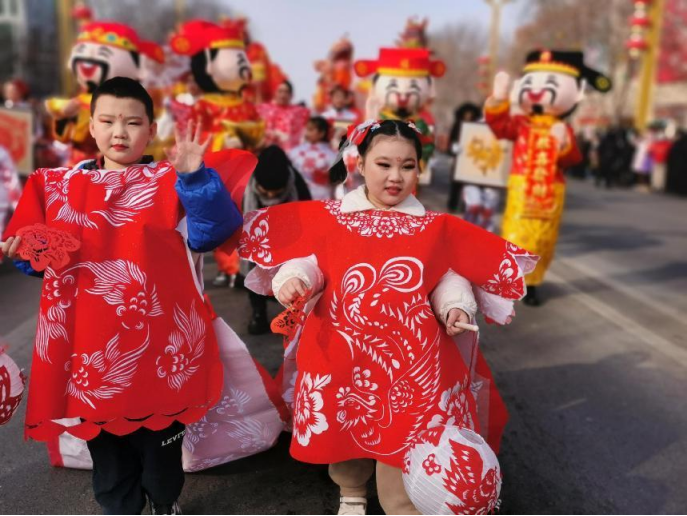 “送你一张‘小蛇剪纸’,新年顺遂!”社火现场,社火演员们向观众发放小巧精致的剪纸作品。既有经典的窗花样式,也有萌趣的卡通生肖,红纸翻飞间现场笑声不断。