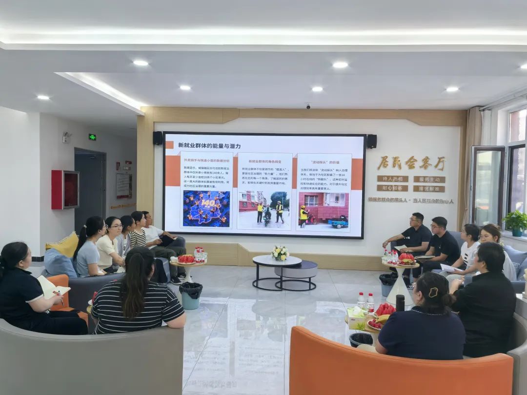 本期沙龙活动以“如何点燃新就业群体的治理热情”为主题,展开深入交流与探讨。幸福社区党支部书记王若寒率先分享了社区在调动“快递小哥”“外卖小哥”等新就业群体参与社区治理方面的经验做法。王若寒说:“幸福社区坚持以党建引领为核心,通过备案、报到、进群、建档四步走,把新就业群体融入社区党组织‘大家庭’,实现了从‘松散流动’到‘组织凝聚’的转变。”