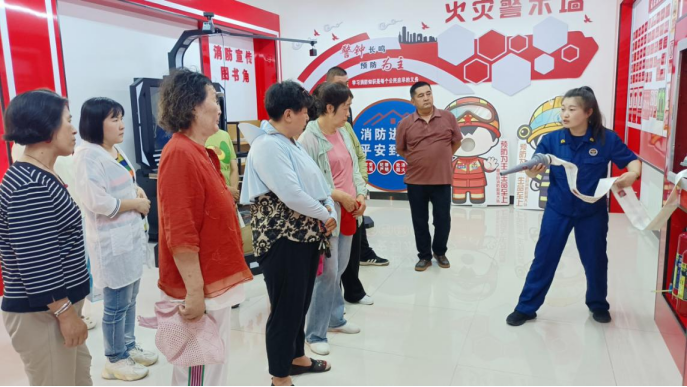 在消防大队培训区域,消防员朱秀丽围绕消火栓使用展开重点教学。她一边细致讲解 “按下启泵按钮、展开水带、连接水枪、打开阀门喷水” 的操作步骤,一边进行规范演示。为确保大家真正掌握技能,消防员邀请居民和商户代表现场实操,并在旁耐心指导,及时纠正不规范动作,让理论知识切实转化为实践能力。