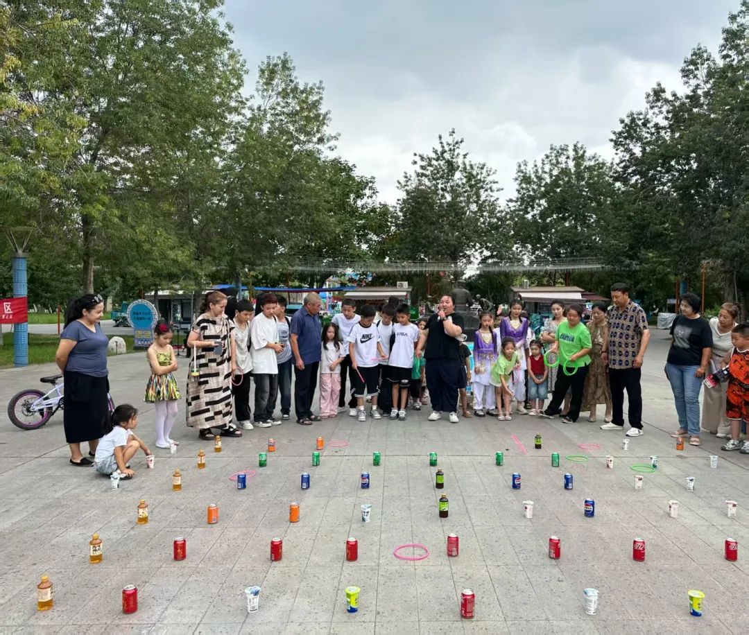 才艺表演结束后,舞台旁还设置了套圈游戏,彩色的塑料圈整齐地堆在一旁,地上摆满了零食。“再往前一点,对准那个酸奶!”小朋友们踮着脚,屏住呼吸,手一扬,塑料圈在空中划出一道弧线,“中了!”他兴奋地跳起来。她们轮流投掷,偶尔失手时互相打气,成功套中便手拉手欢呼,广场上热闹得像一场盛大的派对。