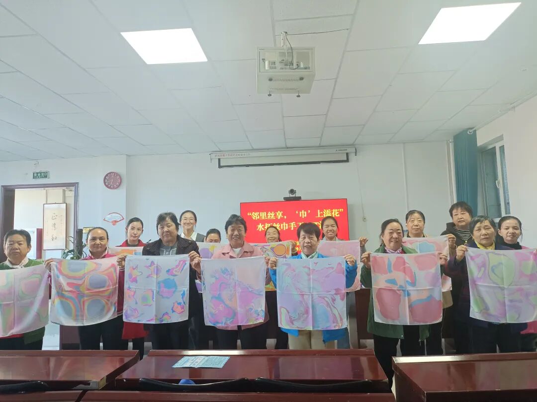 居民们全身心沉浸在水拓丝巾创作中,每一步都充满创意与惊喜。从最初的生疏探索,到后来的熟练创作,欢声笑语始终萦绕。随着活动的温馨推进,居民在水拓丝巾的创作中,解锁了手工艺术的趣味,也定格了一段满是创意与欢笑的时光。邻里间的交流在创作中升温,情谊在陪伴中加深,为原本平淡的生活,晕染出一抹灵动而亮丽的色彩。活动结束时,大家纷纷拿起亲手制作的丝巾展示,每一件作品都承载着创作的快乐,也定格了这段难忘的手工时光。