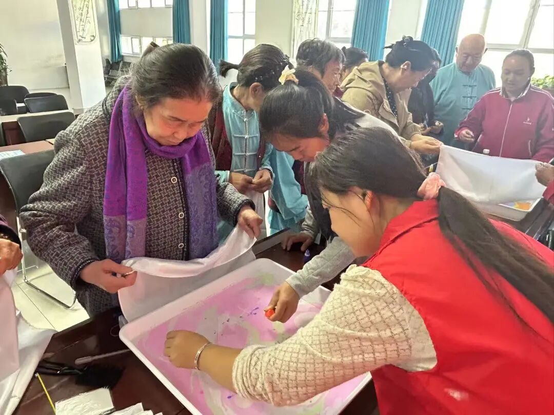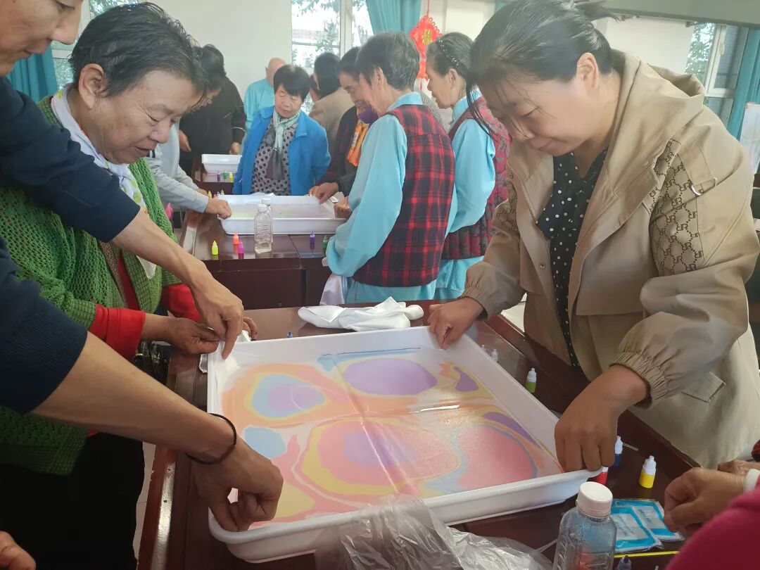 活动伊始,志愿者率先为居民讲解水拓丝巾的基本原理与操作技巧,然后将特制颜料缓缓滴入调配好的水中,色彩在水面渐渐晕染开,如梦幻的画卷徐徐展开。接着,手把手指导居民运用工具在水面拨弄颜料,勾勒出各式各样的花纹。居民满怀热情地参与其中,有的专注地拨弄颜料,让色彩形成灵动的线条;有的巧妙地点染色彩,晕出烂漫的山花;还有的居民发挥丰富想象,描绘出流云晚霞的图案。