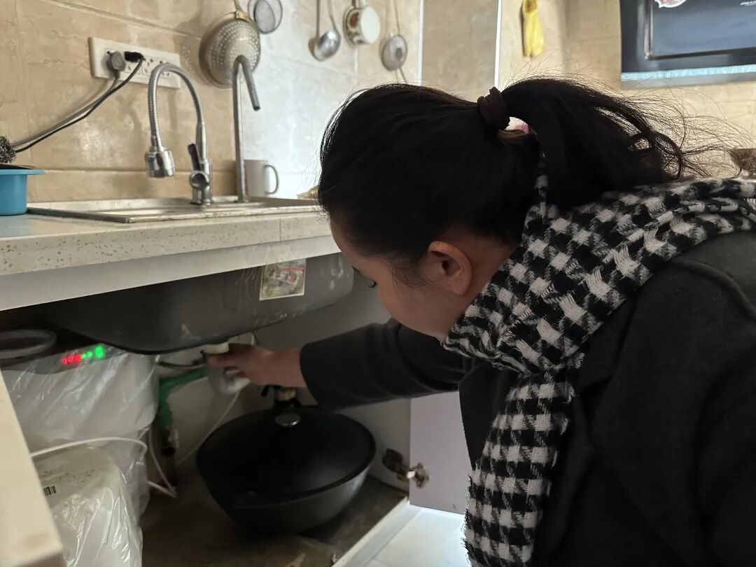 到达居民家中时,厨房暖气管道的漏水点正不断向外渗水,地面已积起一层水。古扎努尔一边安抚居民情绪,一边迅速关闭暖气总阀门。随后,她仔细检查了居民家厨房漏水原因,经检查,确定是接口处的密封垫破损。