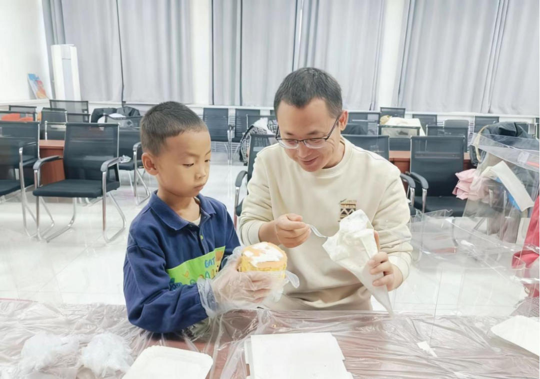 制作过程中,亲子家庭配合默契。孩子们踮着脚认真观察,主动递送工具,家长们则细心引导,与孩子共同构思设计。水果蛋糕、奶油花朵、卡通图案……每一款蛋糕都饱含着亲子间的默契与爱意。家长刘翠娜看着孩子第一次独立完成裱花,开心地说:“孩子第一次学裱花,我们都很开心,这样的活动既让孩子学到技能,也让我们更懂彼此,太有意义了。”苏比努尔也说道:“能用自己的特长为邻里服务,特别有成就感。”