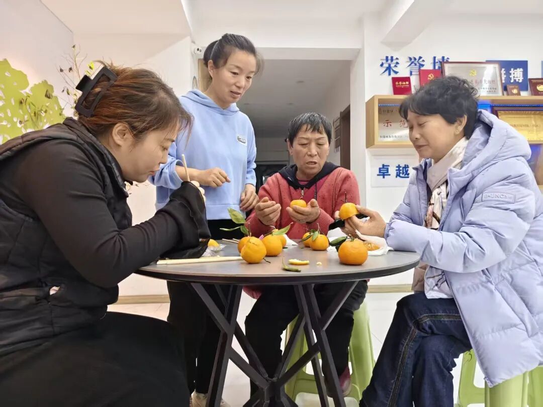 在场居民们听得专注、学得认真,老人们凝神细作,孩子们跃跃欲试,遇到手劲不足、眼神模糊或是操作生疏的情况,邻里间便主动搭把手、齐帮忙。大家围坐一堂,手中忙着塑形、穿灯、装饰,嘴里聊着家长里短,时不时分享剥好的清甜橘瓣,酸甜果香混合着欢声笑语,在空气中弥漫开来。“平时在家多半是看看电视、读读书,今天能和邻居们坐在一起剥橘子、唠家常、做手工,感觉好久没这么热闹了,心里特别暖!”徐代嫦阿姨一边专注地装饰橘灯,一边笑着说道。随着一盏盏造型别致的橘灯逐渐成型,居民间的陌生感悄然消散,邻里情谊在指尖流转、在谈笑中升温。