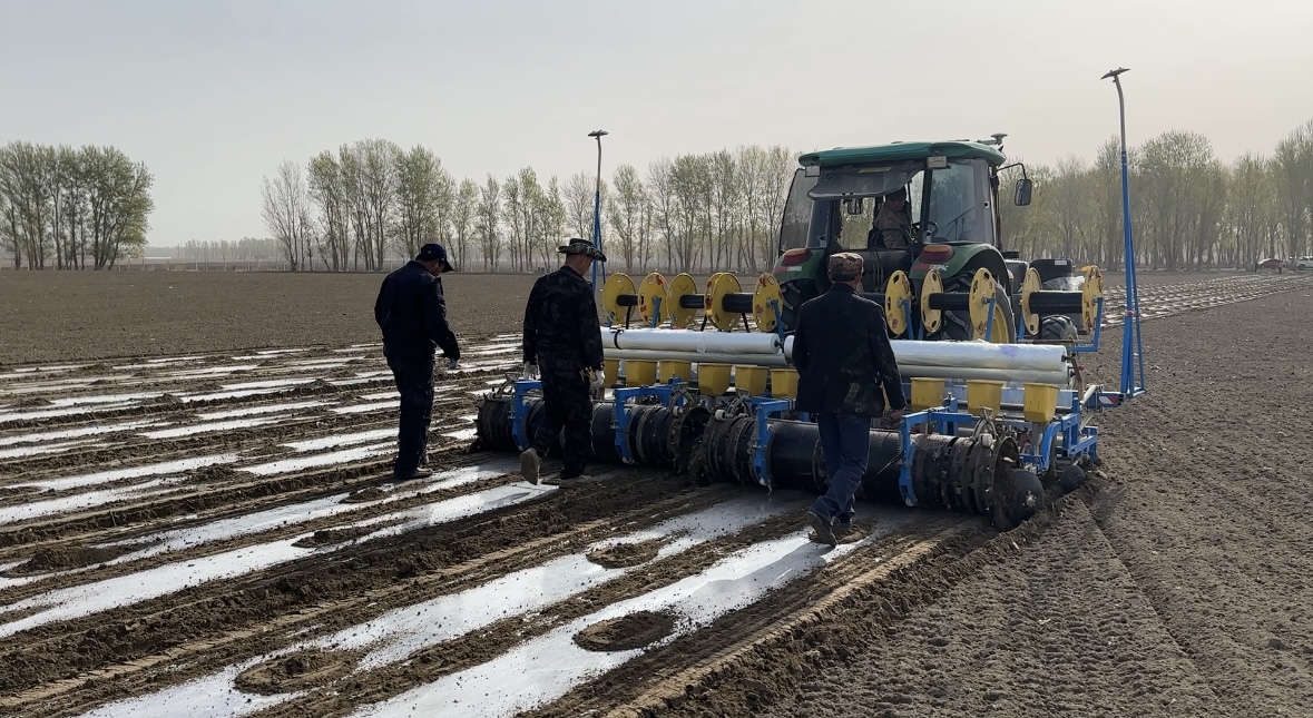 在托托镇托托新村3号条田的一块棉田里,三台大马力搭载北斗导航系统的播种机在高标准农田里来回穿梭,播种机实现了无人驾驶作业,一次性可完成铺膜、铺滴灌带、播种、覆土等多项作业,种植户姜文庆带着工人紧跟播种机查看开沟、下种、铺膜、覆土等情况,呈现一派繁忙景象。