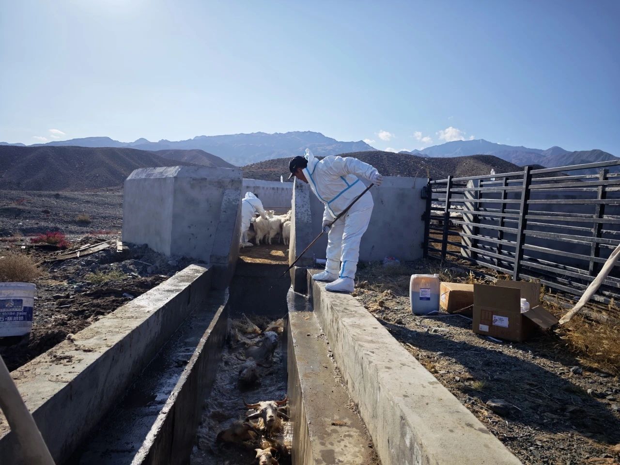 为达到防疫效果,牧民在技术人员的指导下,有序驱赶羊群进入药浴池,给羊群进行药浴,工作人员在浴羊池两旁手持工具压扶,在确保羊不被呛水的情况下,将羊头部压入药液中,保证药浴覆盖面达到100%。