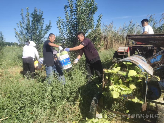 天刚亮,志愿者便带着镰刀、麻袋、三轮车等工具赴田间,蹲守瓜垄挑选成熟打瓜并归堆,原本需多日完成的地块,经协作3天即采收完毕,效率提升近一倍。