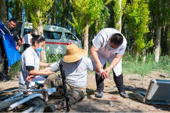 出席本次演练活动的领导有博州农业农机机械化发展中心主任赵大文同志;博州农业综合行政执法支队副支长王瑞敏同志;博州农业农村机械化发展中心推广科技副科长冯雄同志;精河县农业农村局副局长达林塔同志;以及阿合其农场分管农业领导、场安全生产办、农机安全监理站、阿合其卫生院、中华联合财产保险公司、各农牧业队(社区)党支部书记、农机安全员、农机大户等40余人参加演习观摩。演练以农机事故为背景,模拟了农户厄某驾驶拖拉机给棉花打药,在出路口时因操作不当与骑自行车的群众李某相撞,造成胳膊小臂骨折。事故发生后,厄某用手机紧急报案,精河县农机安全监理站接到电话后,依照应急程序启动农机事故应急预案,开展应急处理和救援。