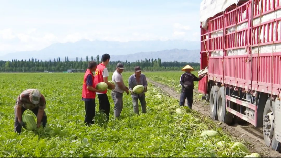 盛夏时节,瓜果飘香。眼下,正是西瓜成熟的季节,阿合其农场的西瓜迎来大丰收。在阿合其农场农二队职工伍杨庆家的西瓜地,伍杨庆正忙着在自家地头的凉棚内销售西瓜。摆放整齐的西瓜,吸引了许多顾客前来购买,他笑得合不拢嘴。“6月26号开园销售西瓜,目前已经卖了近300吨。今年的产量和价格都不错,预计收益可以达到95万元。”他高兴地说。阿合其农场地势平坦,土层深厚,光照充足,水源丰富,是种植瓜果的上佳区域,吸引了不少外地客商慕名而来。博乐市兴农果蔬批发市场商户赵永亮就是其中之一,他已经连续8年在阿合其农场采购西瓜了,此时他正在瓜地里指挥工人采摘、搬运、装车。赵永亮说:“阿合其农场的西瓜使用的都是有机肥,品质特别好,在市场上非常受欢迎。现在我已经装了6车西瓜了,这次我计划购进30吨西瓜。”伍杨庆说:“我种瓜已经有5年了,有固定的客源,他们提前支付定金,等西瓜成熟就来拉,双方都非常信任。主要还是因为阿合其农场的西瓜品质好,大家都认准了阿合其农场西瓜注册商标‘国小其’。”