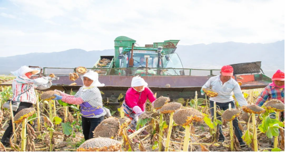 阿合其农场牧业队五台社区居民刘国朋说:“最近正是食葵收获的季节,我们在地里采收食葵,每天都能挣到钱,大伙都特别高兴。”