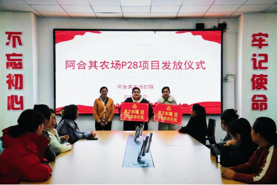 2月22日下午,阿合其农场举行“p28项目”资金发放仪式,为阿合其农场2名创业妇女发放了30000元P28项目资金,各村队(社区)妇联主席,及本次项目受益人参加了发放仪式。