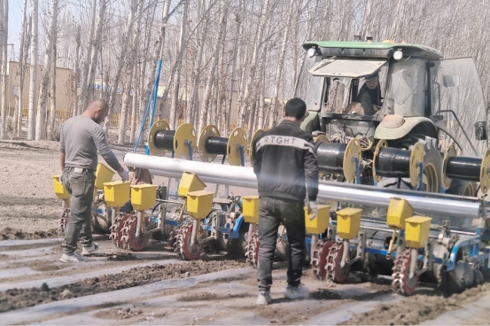 棉田里,伴随着轰鸣的农机作业声,采用了先进的机械化和北斗自动化技术的播种机正在田间穿梭,种植户郭占臣带着工人紧跟播种机查看开沟、下种、铺膜、覆土等情况。现代化的播种机不仅减轻了棉农的劳动强度,还提高了播种的精准度,为棉花的后期生长奠定了坚实的基础。