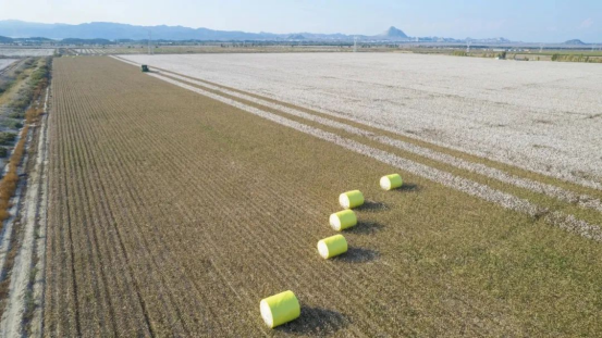 近年来,阿合其农场大力实施农作物大面积单产提升行动,建立与机采棉相适应的技术路线,不断提升机械化采收率,采收时可以一边采收一边打包,把棉花自动压缩成一个个两吨左右的大棉包,种植户也亲切把它叫做“下蛋机”。