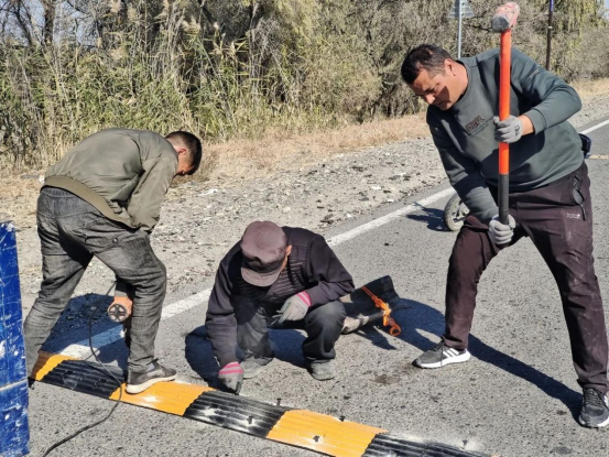连日来,在阿合其农场,一项温暖人心的为民办实事行动正在进行。当前正值秋收时节,为了确保群众出行安全,阿合其农场积极组织力量修复道路减速带,为群众系紧“安全带”。
