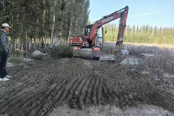 为保障秋收工作顺利进行,农四队党支部第一时间响应,由党支部书记陈红雨带队,组织一台挖掘机对受阻路段开展紧急平整工作。