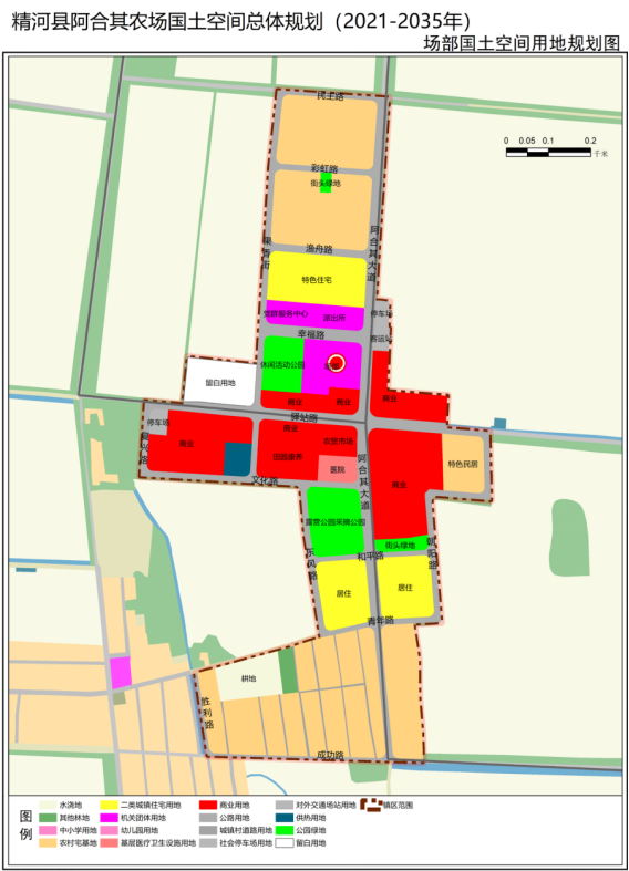 规划通过对阿合其农场场部驻地现状、自然地理要素、周边永久基本农田保护线、场部发展战略、重点产业项目、重要交通设施布局等多影响因素进行分析,合理用地布局,完善场部驻地居住、商贸、文旅、公共服务等功能。