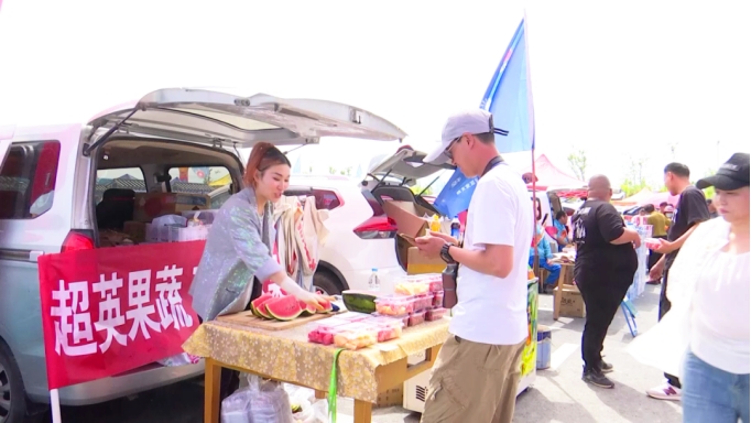 在赛马场“后备厢集市”看到,摊主们将私家车辆停靠整齐,后备厢里摆满了琳琅满目的商品,吸引了不少游客前来围观挑选商品。个体经营户王超英说:“今天特意准备了新鲜的西瓜 、哈密瓜,都是解暑解渴的,特别受顾客的欢迎,一上午卖了300元,生意还不错。”
