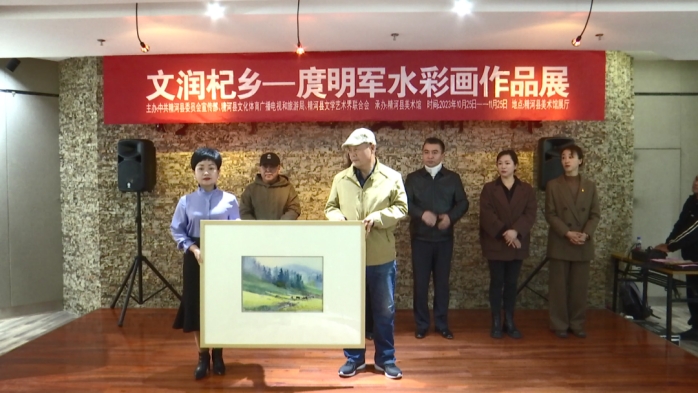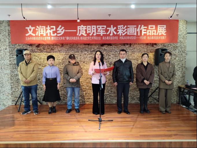 上午11时30分,赵萍宣布文润杞乡—庹明军水彩画作品开幕。她表示,此次推出庹明军水彩画作品展,旨在深入推进文化润疆工作,激励精河文化文艺人才创作热情,更好地繁荣和发展精河县文化事业的重要举措。希望庹明军以此次展览为起点,不忘初心、砥砺前行,创作出更多更好的无愧于这个时代的文艺作品。