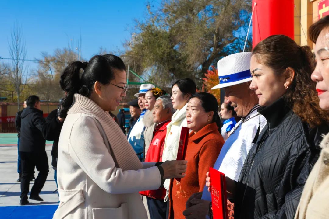 赵萍在致辞中讲到,今年以来,精河县以铸牢中华民族共同体意识为主线,以推进文化润疆工作为抓手,培育和践行社会主义核心价值观,创新实施文化惠民工程,开展了“我们的中国梦”—文化进万家、“我们的节日”主题系列活动、“百日广场文化艺术节”等群众性文化活动,在全县形成了波浪式的文化活动热潮,吸引了数万名各族群众广泛参与。同时,带动精河县文化文艺爱好者参与创作了一批正确反映新疆历史、具有中华文化底蕴、融合现代文明、群众喜闻乐见的文学、摄影、美术、书法、戏曲等各类优秀作品,为精河县高质量发展赋能。随后,县文旅局党组书记、副局长黄雪丽宣读了《关于精河县2023年“优秀文化带头人”命名表彰的决定》。赵萍为各乡镇场(街道)优秀文化带头人颁奖,并宣布精河县“群众村晚”文体系列活动正式启动。