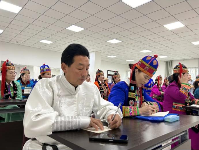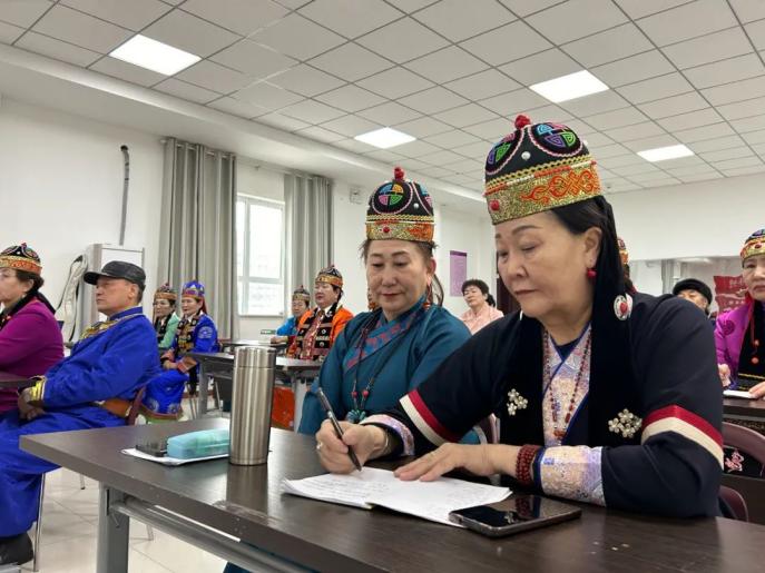 在县文化馆群众活动室内,国家级非物质文化遗产项目江格尔自治区级代表性传承人满都来正在给学员们讲述江格尔的历史文化。学员们听得津津有味,不时拿出纸笔,认真做笔记。