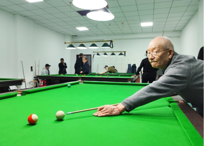 在冠亚军争夺战中,双方选手你追我赶,比分焦灼。经过激烈角逐,最终来自精河县锦园社区的参赛选手李钦堂荣获冠军。81岁高龄的李钦堂也是一位资深的台球爱好者,12年的台球运动经验让他在这场比赛中发挥稳定并取得冠军。他说:“这项运动既能活动身体又不会太激烈,很适合老年人。而且,还能增进和年轻人的交流。今天能拿到冠军,我很开心,同时也觉得很幸运,寓意着新年会有好运气。”