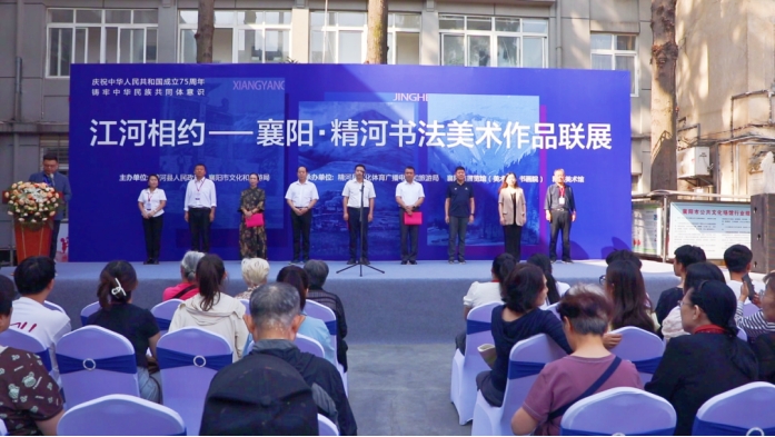9月26日上午,由精河县人民政府、襄阳市文化和旅游局主办,精河县文化体育广播电视和旅游局、襄阳市展览馆(美术馆、书画院)、精河美术馆承办的江河相约——襄阳·精河书法美术作品联展在襄阳市开幕。襄阳市文化和旅游局党组成员、副局长骆建武,精河县人民政府党组成员、副县长亚里坤·阿地里,襄阳市文化和旅游局一级主任科员陈建平,襄阳市图书馆党总支副书记、副馆长汪全新,襄阳市展览馆(美术馆、书画院)副馆长,湖北省女书法家协会名誉主席杨晓琳及精河县相关部门负责人、襄阳市艺术家代表、参展作者、书画爱好者及市民代表等200余人参加了展览。