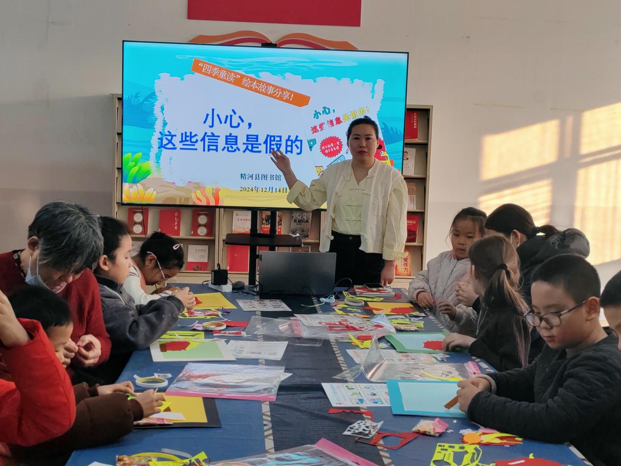 为了帮助孩子们学会鉴别真伪,培养判断力和思辨力。12月14日,精河县图书馆在馆内开展“四季童读”—《小心,这些信息是假的》故事分享会。