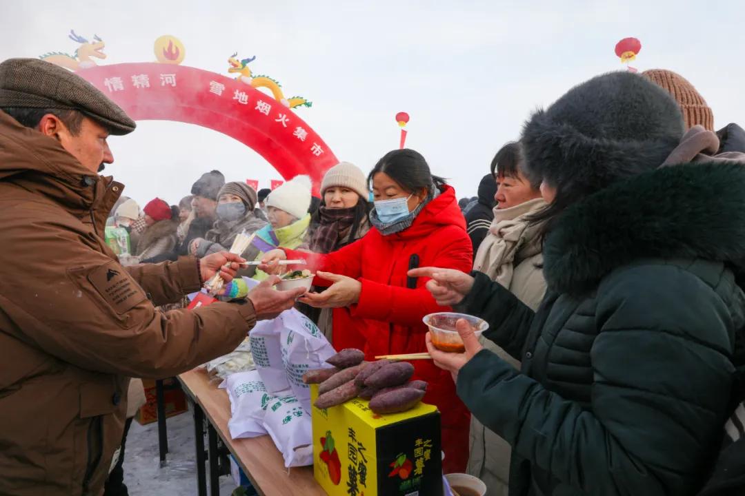 紧邻篝火的火锅品尝区同样热闹非凡。雪地上多个铁锅一字排开,涮肉、涮菜纷纷下锅,寒冷空气中弥漫着香浓热气,吸引众多游客前来品尝,体验舌尖上的“冰火两重天”。近百人围着吃火锅,场面壮观,即便彼此陌生,在热气腾腾的火锅旁涮上几下,便熟络说笑起来。游客李桂梅称赞道:“一边是冰天雪地,一边是篝火蹦迪和火锅飘香,这种冰火两重天的感觉太独特了。”
