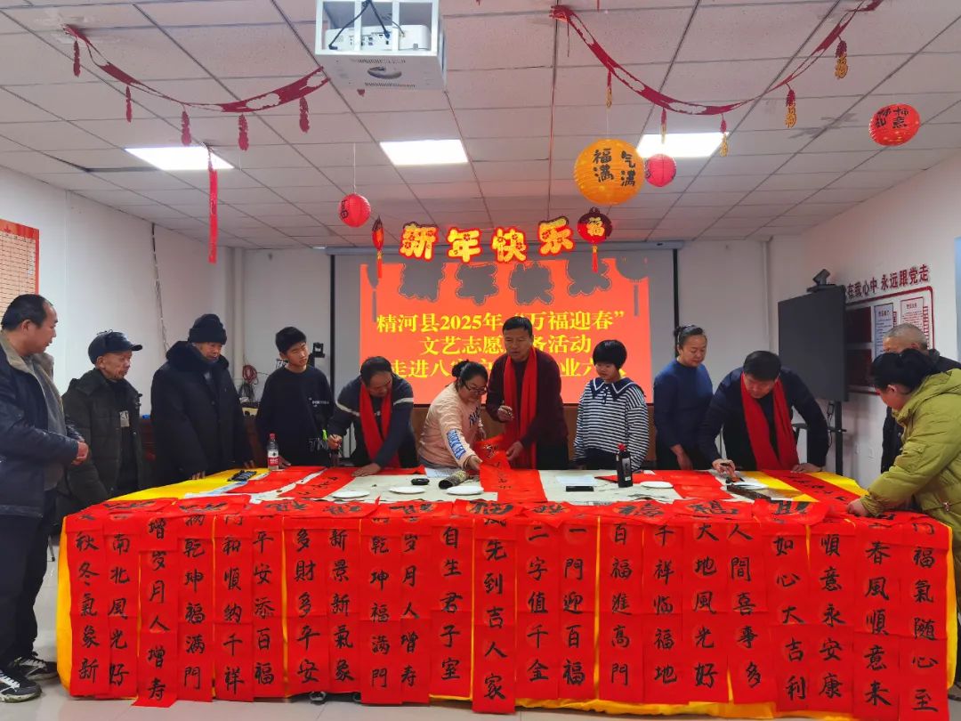 在春节来临之际,为弘扬中华优秀传统文化,增添浓郁的节日气氛,1月13日,精河县委宣传部、县文联、县文体广旅局联合开展精河县2025年“我们的中国梦—文化进万家”迎新春写春联送祝福文艺志愿服务活动。活动当天,精河县书法家们分别来到八家户农场农六队、农七队等地现场挥毫泼墨,书写春联、送春联,将真诚的祝福付诸笔端。“金龙含珠辞旧岁,银蛇吐宝贺新春”“春舞蛇毫添富足福传龙墨点金睛”一副副寓意吉祥如意的春联成了深受群众喜欢的精神文化年货,现场营造了欢乐祥和的节日氛围。
