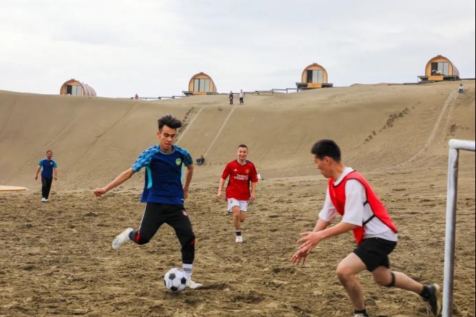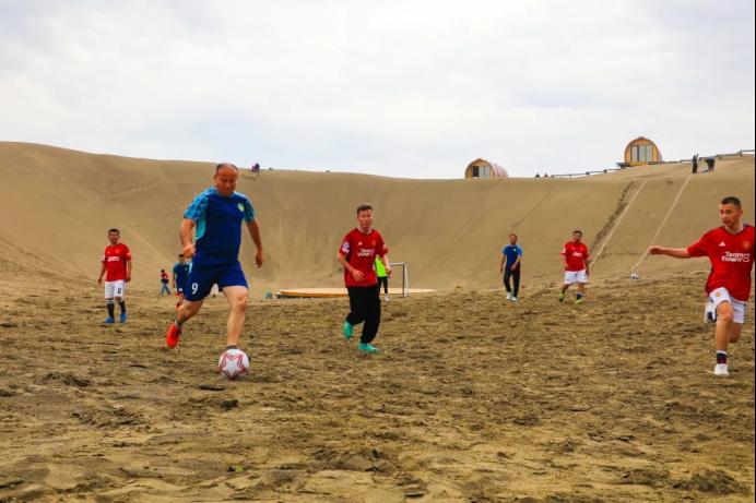 与此同时,景区另一侧的沙滩足球表演赛同样精彩。4支球队在松软沙地上展开激烈角逐,不同于绿茵场的坚实地面,沙漠足球场每一步奔跑都伴随着下陷的阻力,每一次传球、射门都需要更强的爆发力。球员们虽气喘吁吁,却越战越勇,沙粒飞溅间尽显拼搏精神。