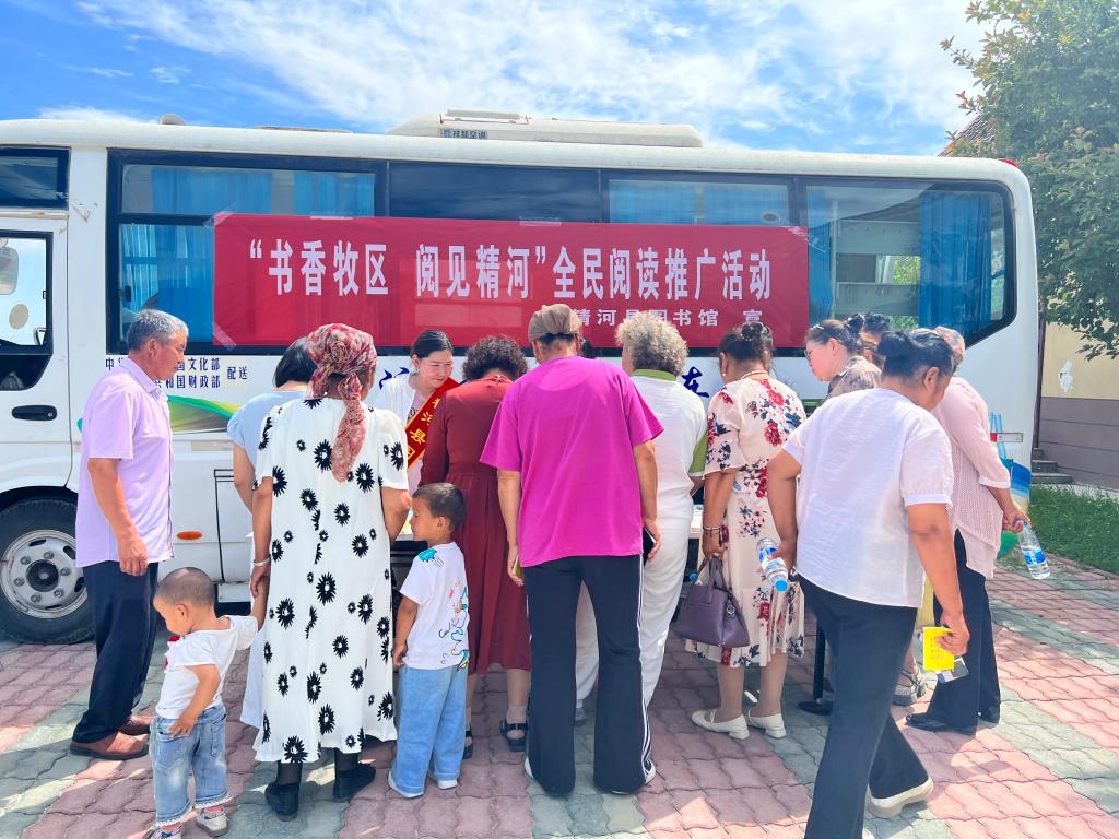 活动当天,精河县图书馆的流动图书服务车载着农业技术、文化科普、少儿读物等多类书籍驶入牧区。工作人员现场为牧民办理借还书手续,并根据阅读需求推荐合适图书。这辆会移动的“图书馆”有效解决了牧区群众“借书远、看书难” 的问题,让牧民在家门口就能享受便捷阅读服务。