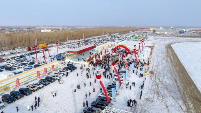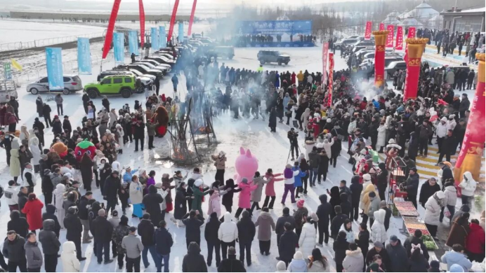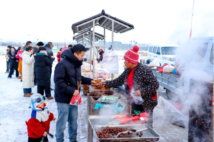 汽车雪地拔河项目同样热闹非凡,独具特色的冰雪竞技,引得现场观众连连叫好、大呼过瘾。特色美食展销区吸引不少商户参与,烤肉、手工馓子、奶制品等特色美食,鲜香四溢、烟火气十足。商户李敏高兴地说:“今天特意带来了板栗、红薯、爆米花等零食,这一会儿就卖了几百块钱,生意还不错。”