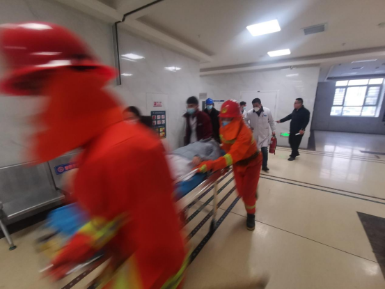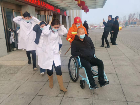 演练模拟从应急响应、人员疏散(搜救)、伤员紧急救治、安全保卫、物资发放及消毒消杀等不同环节处置同时进行演练。在演练过程中,随着地震警报响起,全体医护人员立即进入紧急避险状态,抱头蜷曲身体就近躲避在桌下或墙角边进行自我保护。震感减弱后,立即响应集结,在现场指挥长的命令下各组按照分工立刻引导患者及家属快速有序撤离病房,对撤离人员进行清点,对受伤人员进入紧急医疗救治等工作,整个演练过程环节紧凑,应急人员分工明确,反应迅速,配合默契。