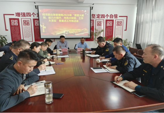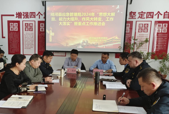 为认真贯彻落实精河县十五届第五次党委常委扩大会议及精河县召开2024年“思想大解放、能力大提升、作风大转变、工作大落实”暨重点工作推进会精神。2月20日上午,县应急管理局党委组织应急管理系统召开了应急管理系统2024年“思想大解放、能力大提升、作风大转变、工作大落实”暨重点工作推进会,县党委常委亚尔买买提·马木提、县人民政府副县长才·达拉到会指导并作讲话。